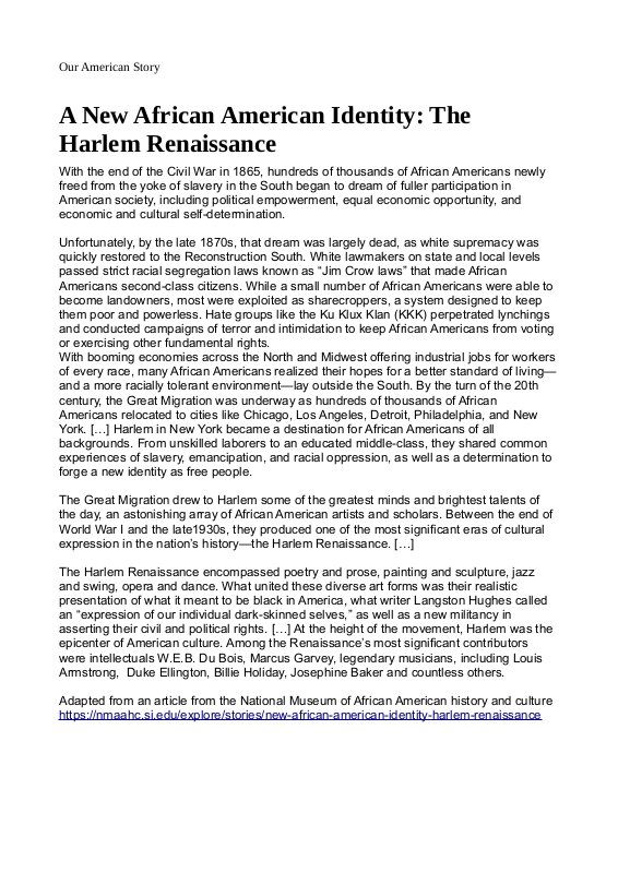 Between the end of World War I and the mid-1930s, African Americans produced one of the most significant eras of cultural expression in the nation’s history—the Harlem Renaissance.